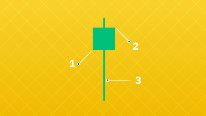 아래에서 시가(1), 종가(2), 심지 또는 그림자(3)를 형성하는 고가와 저가를 볼 수 있습니다.