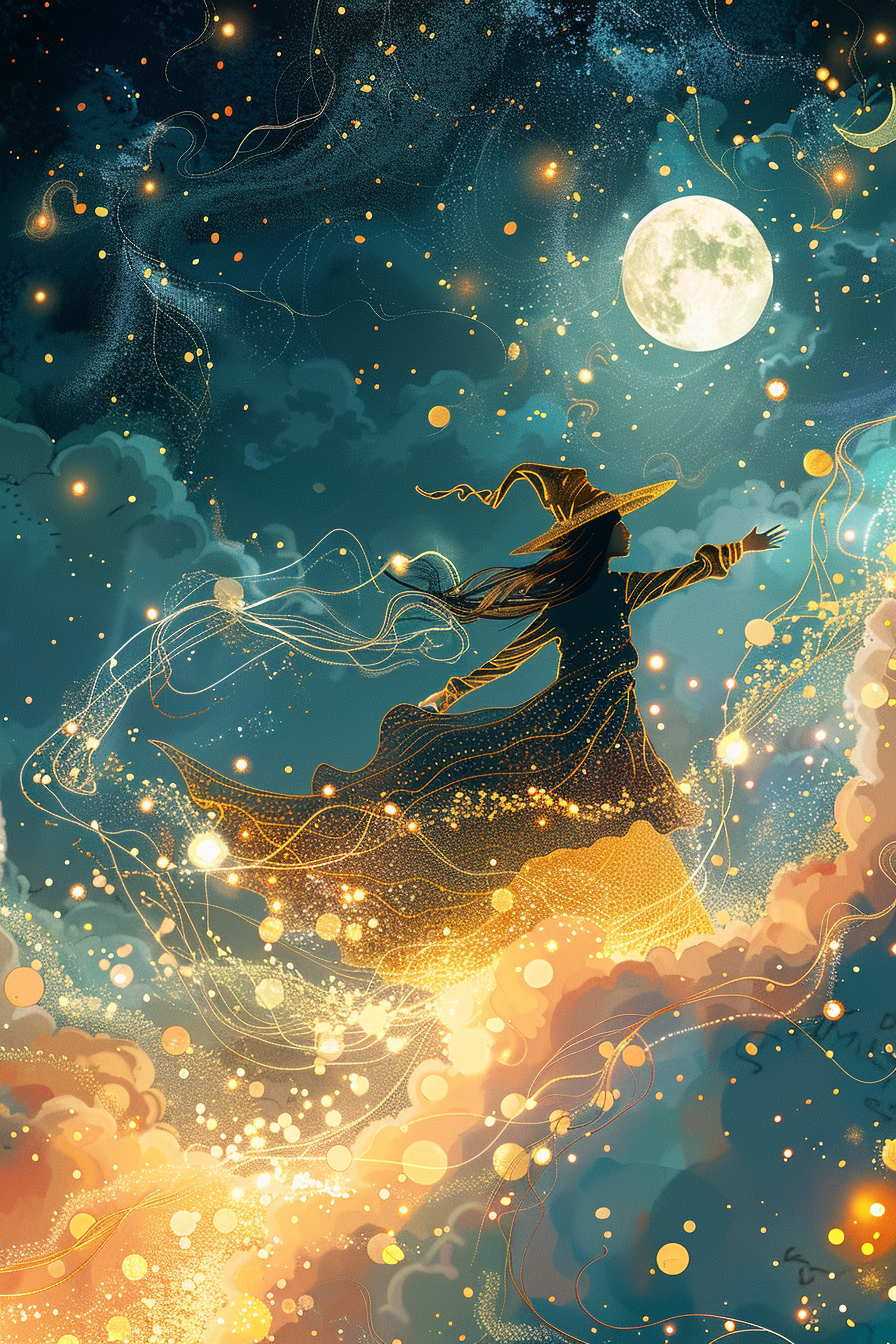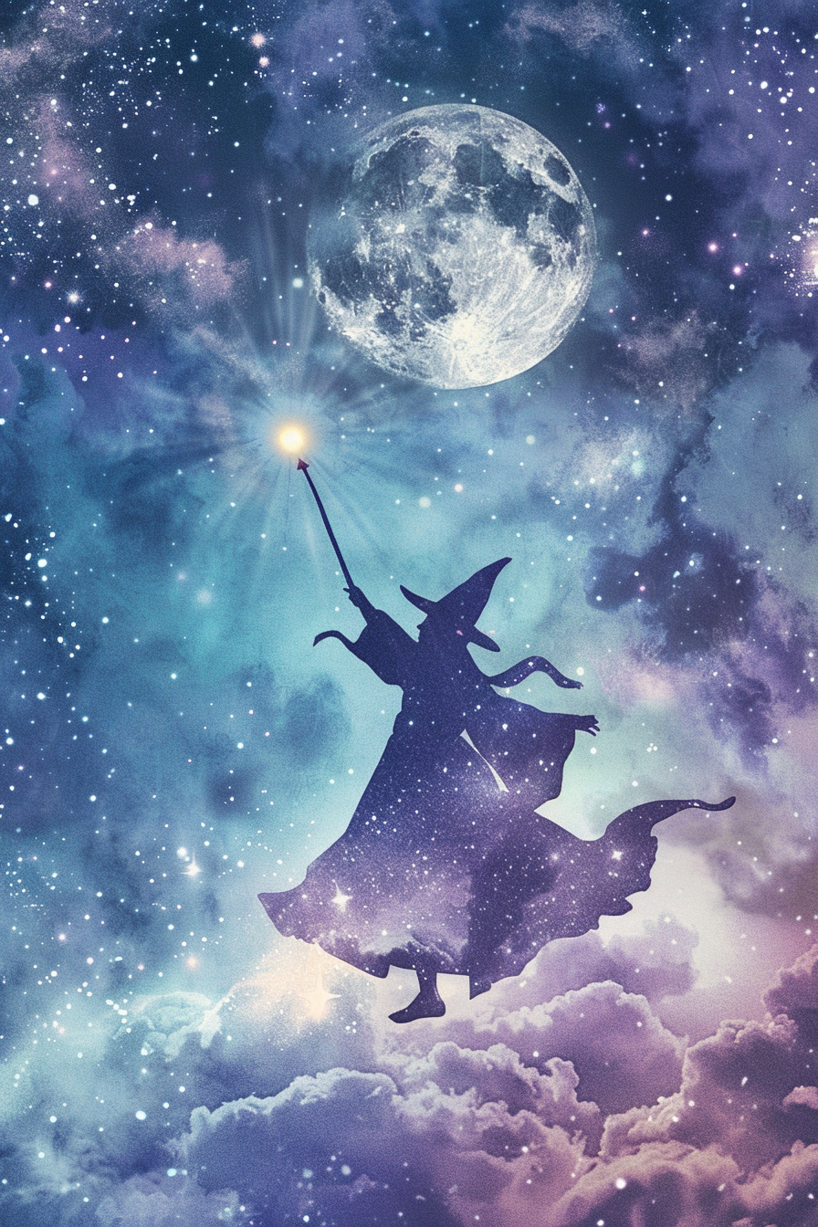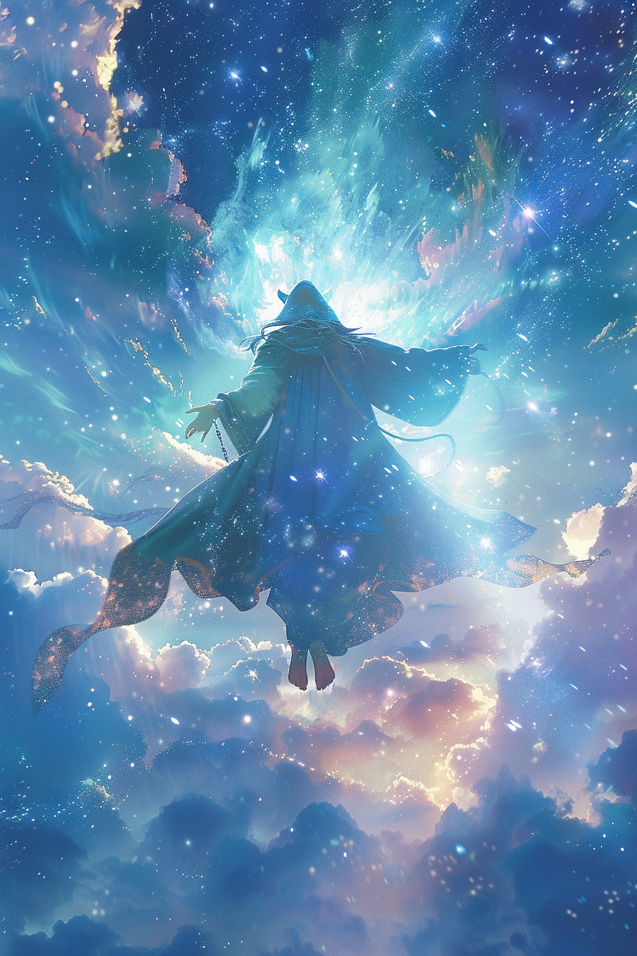 별빛 마법사는 창의적이고 독특한 능력을 상징하며, 구름을 타고 춤추는 모습은 내가 금전적으로 새로운 창의적인 아이디어를 발견하고 실행할 것을 나타냅니다.