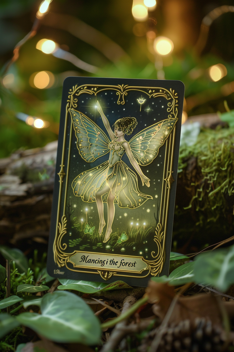 숲과 달빛은 풍요롭고 신비로운 에너지를 상징하며, 춤추는 요정은 자유롭고 환상적인 가능성을 나타냅니다.