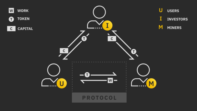 이 모델은 채굴자(공급측), 사용자(수요측) 및 투자자(자본측) 사이의 3면 시장을 나타냅니다. 각 그룹은 희소한 암호화 경제 자원(토큰)을 사용하여 서로 간에 가치를 교환합니다.