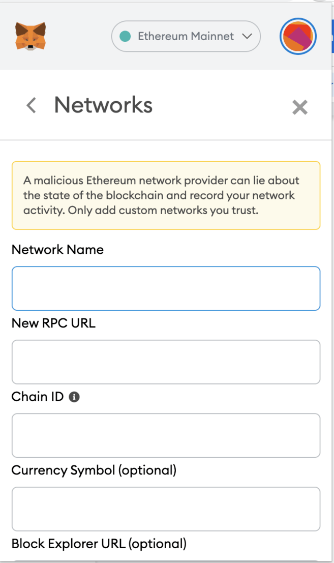 5. 다음으로 메타마스크 계정에 수동으로 BSC 네트워크를 추가해야 합니다. MetaMask 확장 핀을 클릭한 다음 상단 중간에 있는 네트워크 드롭다운 메뉴를 클릭합니다. 목록 하단의 [Custom RPC]를 클릭합니다.