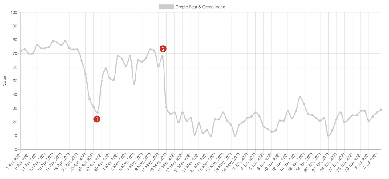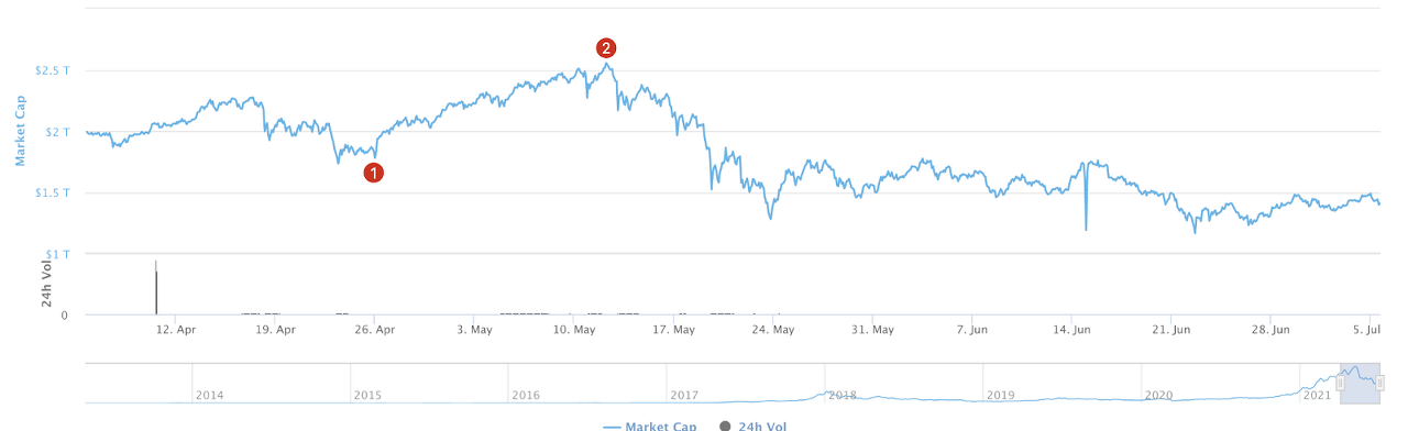 포인트 1은 2021년 4월 26일, 지수 값이 73(탐욕)에서 27(공포)로 크게 변동한 바닥을 보여줍니다. 포인트 2는 2021년 5월 12일 68(욕심)에서 26(두려움)으로 또 다른 슬라이드의 시작을 보여줍니다. 이러한 변화를 전체 암호화폐 시가총액과 비교하여 이것이 암호화폐 시장과 일치하는지 확인할 수 있습니다.